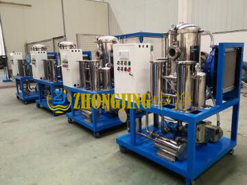 設備采用四級過濾脫水脫氣除雜的功能。首先待處理油液在真空負壓下吸入,經過不銹鋼一級磁性過濾濾器和二級納米分子過濾器后進入紅外線碳纖維加熱器進行預熱,溫度由低向高快速加熱的同時,油分子內部開始分解,轉而進入第三級聚結真空油水分離過濾器中,此過濾器采用親油疏水聚結分離的進口濾材特性進行油水第1次分解,較大的水分子被聚結濾芯分離出來進入儲水罐里面,微水和油分子由分配器進入真空分罐,形成短層的薄膜霧化,經過反應器持續(xù)的工作在罐內形成立體的,多層面的蒸發(fā)結構,通過連續(xù)循環(huán),便可達到凈化目的。最后經過第四級高分子精濾芯,完成一個過濾循環(huán)工作。